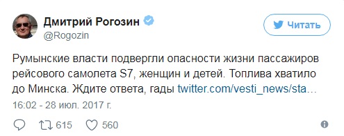 От S7 съобщиха, че румънските власти не са позволили самолетът да премине в тяхното въздушно пространство под претекст, че на борда има "лице, с наложени санкции". Румънското външно министерство заяви, че полетът на Рогозин не е бил договорен с Букурещ.